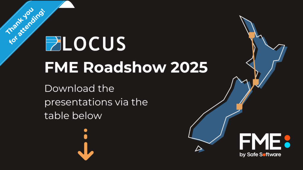| Explore the latest features of the FME 2025 platform release | Chris Morris and Gavin Jeter, Locus | AUT, Auckland, Christchurch Town Hall and Rydges Wellington | Download |